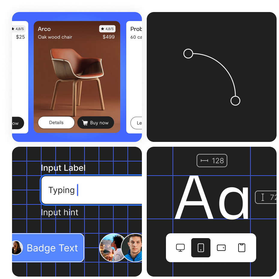Build a complete design system for any digital product. Start with a template or use our building blocks to create your own components. Everything is responsive and interactive by default, and accessibility is built in. You stay creative, we handle the rest. Afaster, more efficient way to work.